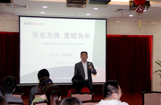 10月21日下午,公司辦公室在五樓多功能廳組織舉辦《化劣為優(yōu),變短為長(zhǎng)——試用SWOT方法淺析安糧實(shí)業(yè)貿(mào)易環(huán)境》專題講座。本次講座由安糧實(shí)業(yè)總經(jīng)理助理祝曉峰(內(nèi)訓(xùn)師)主講。安糧實(shí)業(yè)貿(mào)易業(yè)務(wù)部門和公司系統(tǒng)相關(guān)業(yè)務(wù)部門、職能部室共計(jì)50多人參加了講座。