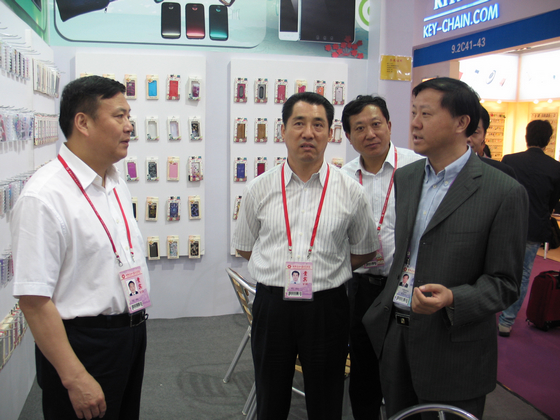 省國資委副主任朱少春(左三)、國貿(mào)集團董事長范陽(左二)巡視公司廣交會展位