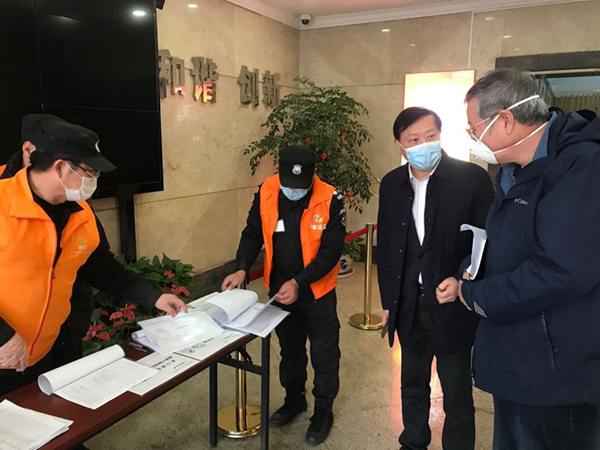 在盛安廣場一樓大廳,包總一行主動接受體溫測量和登記,現(xiàn)場檢查了測溫、消毒及人員進(jìn)出登記工作,聽取了現(xiàn)場工作人員的情況匯報(bào),對他們的辛勤工作表示慰問和感謝,充分肯定了公司疫情防控工作。