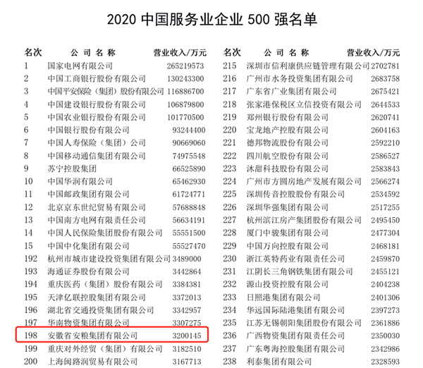 安糧集團位列2020中國服務業(yè)企業(yè)500強第198位
