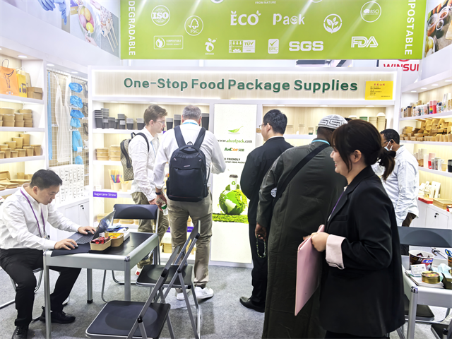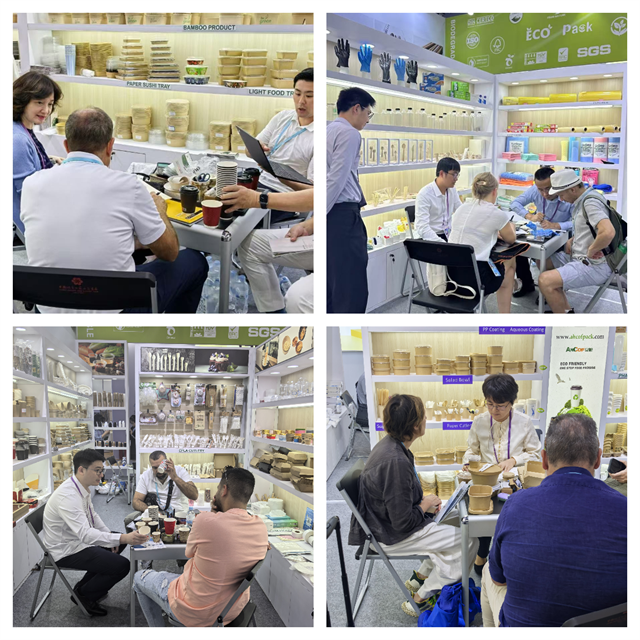 在全球化與個性化的雙重驅(qū)動下,消費者對產(chǎn)品的需求日益多樣化。本期會展安糧積極擴充產(chǎn)品規(guī)格,豐富產(chǎn)品種類,帶來了深受客戶喜愛的全降解紙杯、紙刀叉、紙質(zhì)蘸料杯等一次性日用品。尤其是本次推出的以竹、木、甘蔗渣等為原材料的新產(chǎn)品輕食盒,在開展當(dāng)天吸引了一大批歐美客戶的咨詢。